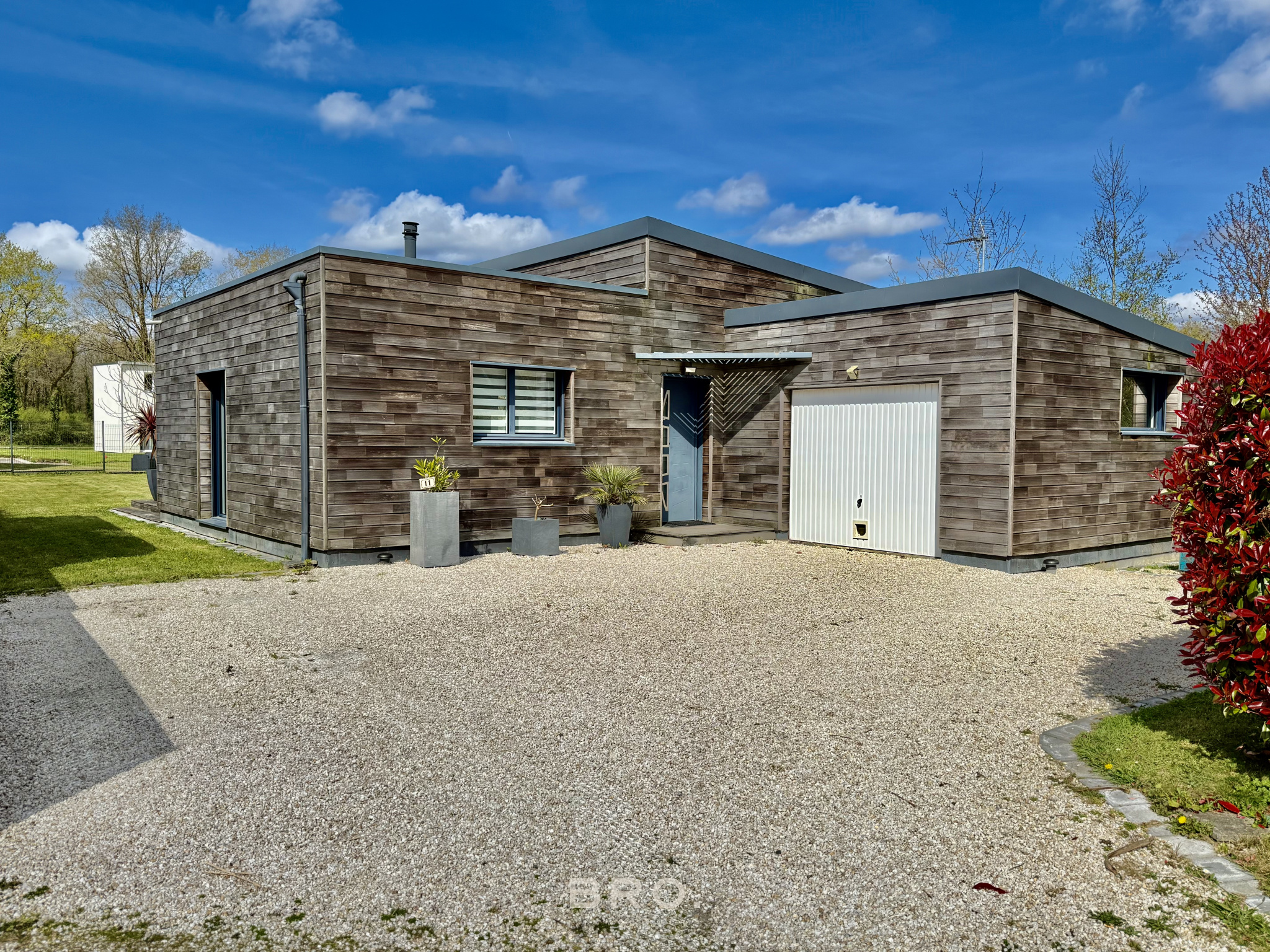 PRÉNOMMÉE « CLÉO », CETTE MAISON DE PLAIN-PIED À OSSATURE BOIS, CONSTRUITE EN 2011, DÉVELOPPE ENVIRON 101 M² HABITABLES SUR UN TERRAIN CLOS ET ARBORÉ DE PLUS DE 800 M², OFFRANT UN CADRE DE VIE CALME ET NATUREL.
